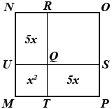 The figure above shows a square region divided into four rectangular regions, three of which have areas 5x, 5x, and x2, respectively. If the area of MNOP is 64, what is the area of square QROS?
