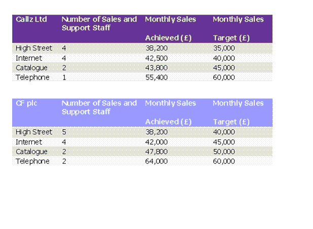 143. Following a merger, the four retail operations are combined with each other across Callz Ltd and CF plc. The targets are also combined for each retail operation, with 5% added to each target for each staff member that works in the combined retail operation. Which combined retail operation has a sales target of £119,000?