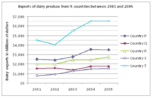 166. Country P’s exports of dairy produce were predicted to rise by 10% per year from 2005 onwards. In dollars, what was the projected figure for exports from country P in 2009?